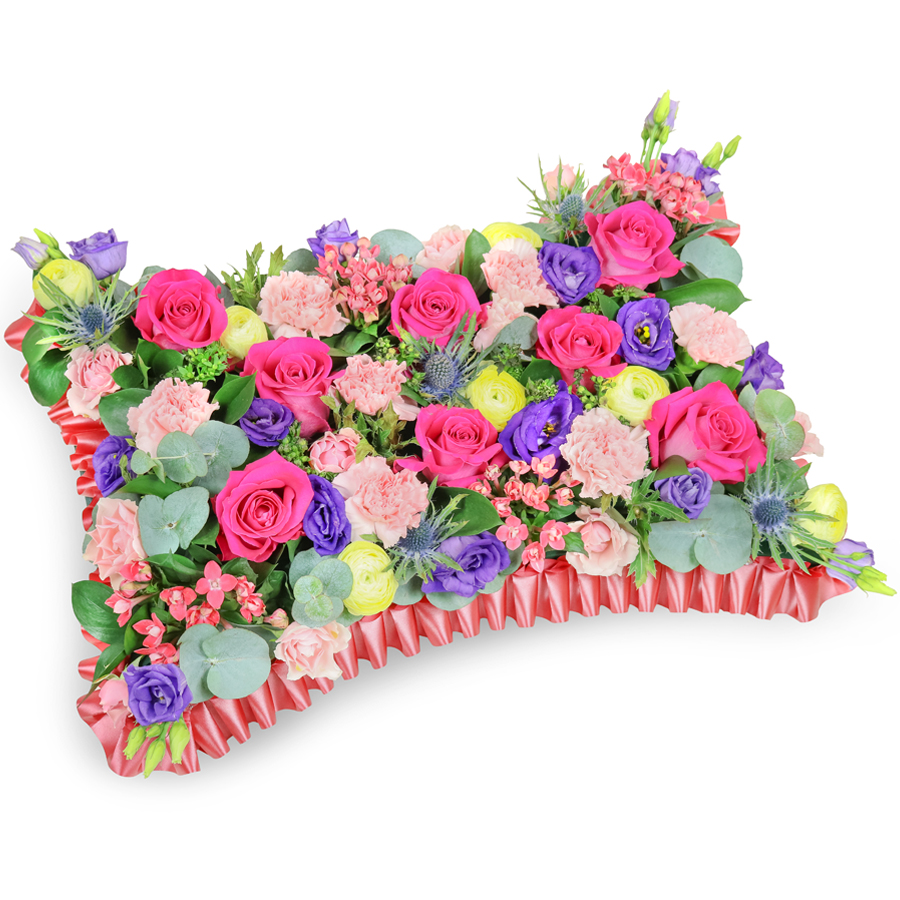 This pillow-shaped design is created using roses, carnations, ranunculus, lisianthus, bouvardia and finished with eucalyptus leaves and ruscus. A lovely arrangement to say what words can not express and honour the life of a loved one.