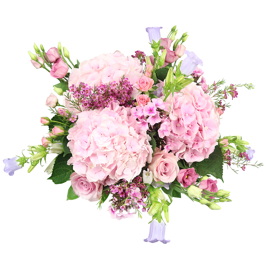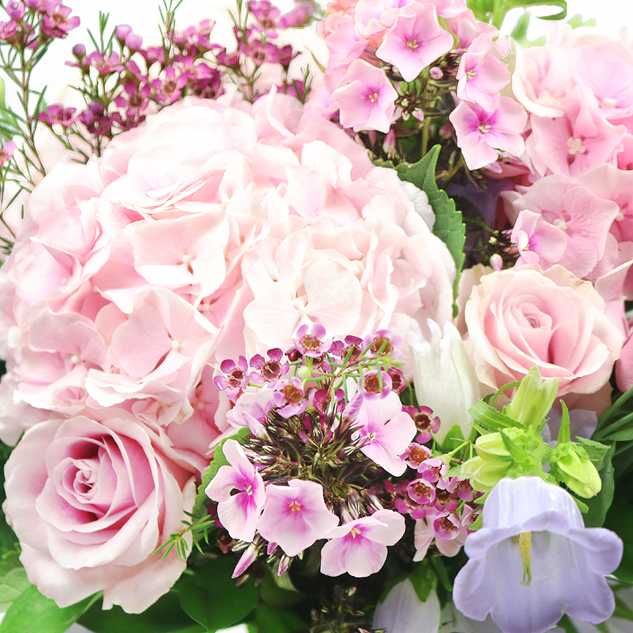 Our Elegant Pink Symphony Bouquet is a masterpiece of floral design, perfect for expressing your heartfelt sentiments. Featuring a harmonious blend of pink roses, hydrangeas, lisianthus, and charming blue campanula.