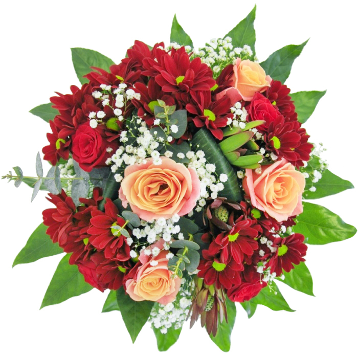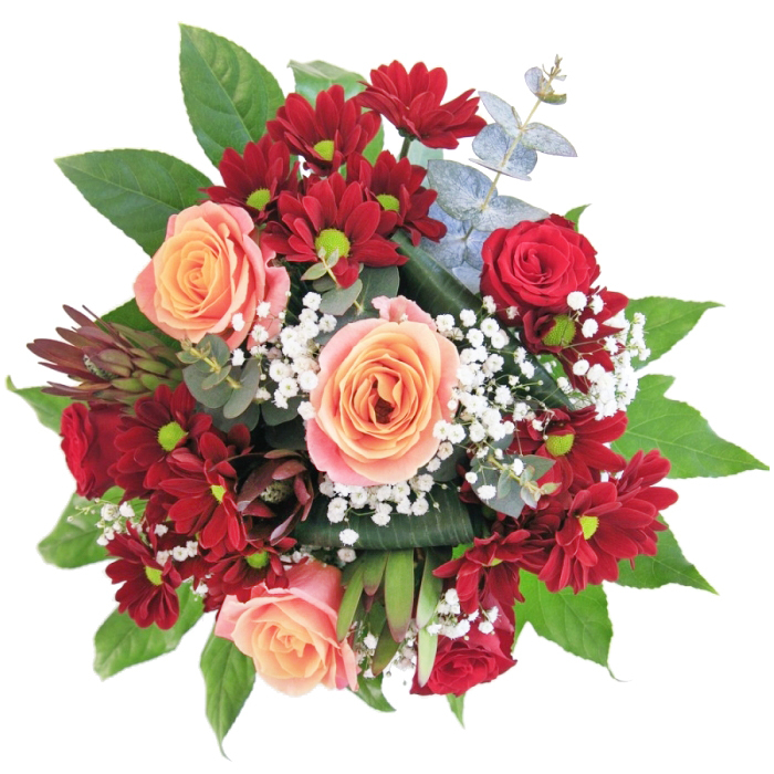 Elevate your gifting with our Radiant Peach & Scarlet Roses bouquet. This beautiful arrangement features sweet peach and scarlet red roses intertwined with deep red spray chrysanthemums. Enhanced by white gypsophila, aralia leaves, and eucalyptus leaves, it offers a luxurious and vibrant display.